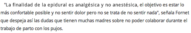 Mira, que me voy a poner de parto en breve de nuevo, y me encuentro con este artículo sobre la epidural, donde una tal Ino Fornet, anestesista del Hospital Puerta de Hierro-Majadahonda (Madrid), explica sus virtudes.