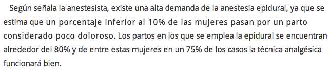 y me da por pensar: «no te jode fastidia, pues claro que existe una alta demanda de la anestesia epidural, ¡pero porque tampoco nos dais otras alternativas menos invasivas y agresivas para disminuir el dolor del parto! Y me consta que haberlas, haylas, y que se emplean con éxito en otros países.