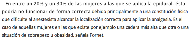 En cuanto a las razones para que no entre la epidural, me da que lo que ocurre es que la mayoría que ve no son en embarazadas. Yo las veo en intervenciones oncológicas y, efectivamente, la mayoría de las que tienen problemas son obesas. Pero en embarazadas no estoy tan segura.